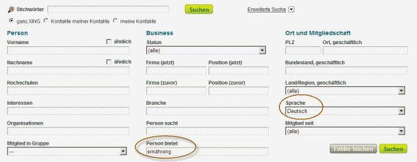 In unserem Fall haben wir einen Suchauftrag eingerichtet, der uns alle Kontakte liefert, die "Ernährung" bieten und - weil wir uns auf D-A-CH konzentrieren "Deutsch" sprechen.
